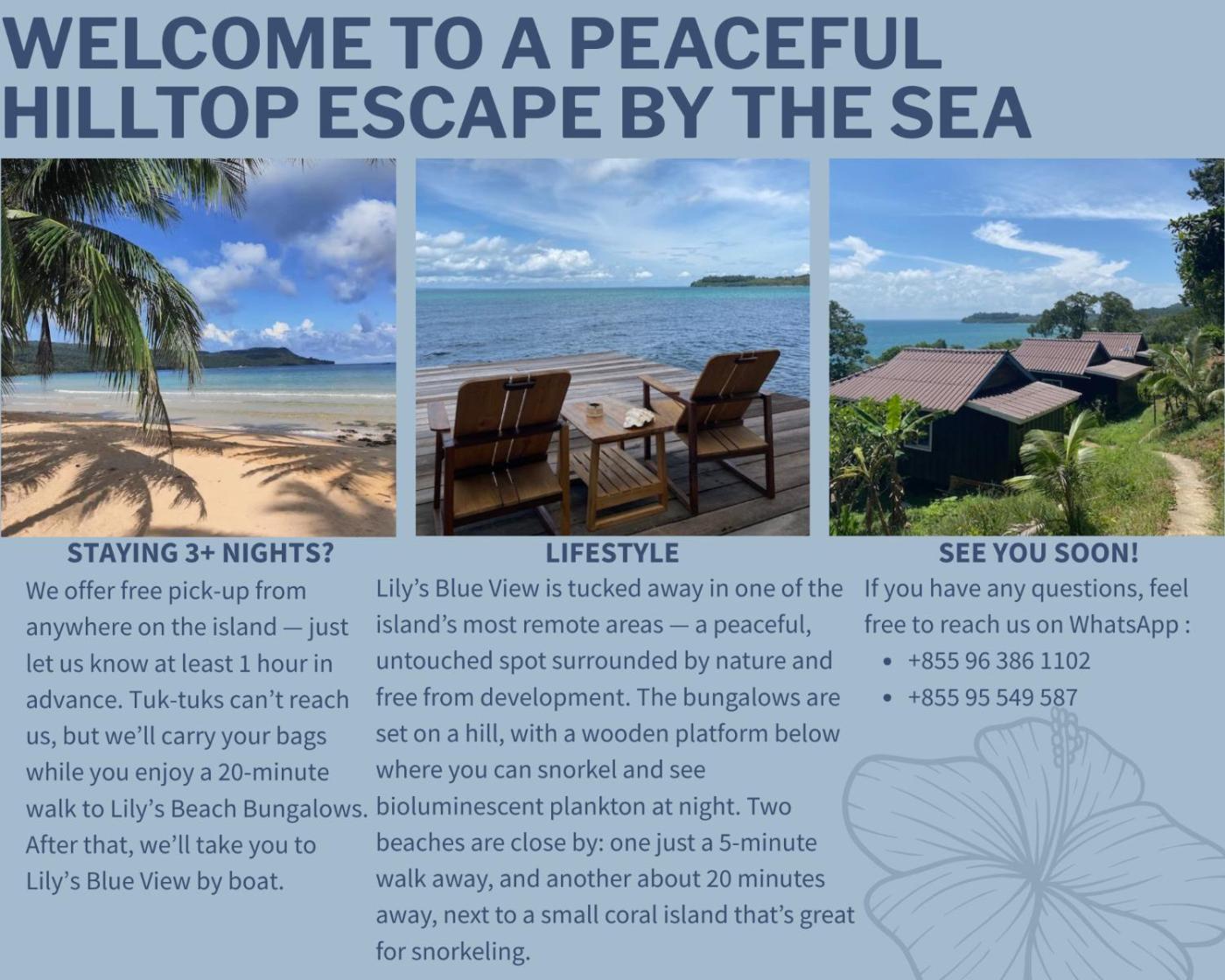 Located in Koh Rong Island, less than 1 km from Lonely Beach, Ocean Blue View provides accommodation with a garden, free private parking, a terrace and a restaurant. Guests can have a drink at the bar.